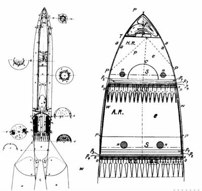 Diese Entwürfe veröffentlichte Oberth 1923 in seinem Erstlingswerk “Die Rakete zu den Planetenräumen”, München 1923.