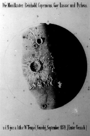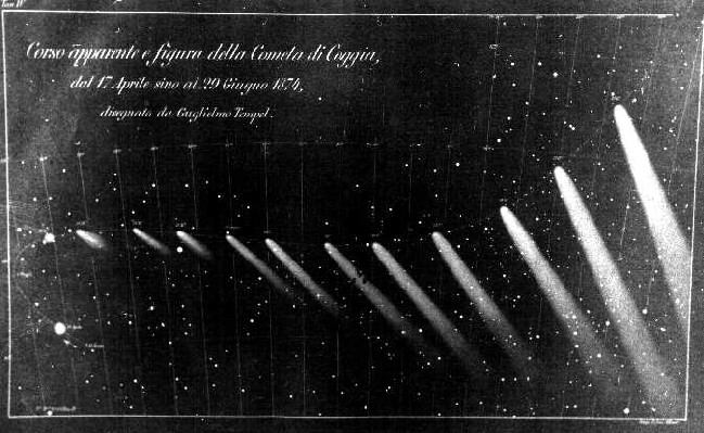 Als im dritten Jahrzehnt des 19. Jh. Wilhelm Tempel geboren wurde, bahnte sich auch die Fotografie ihren Weg ins Leben. 1926 gelangen dem Franzosen Niepce (1765-1833) bei achtstündiger Belichtungszeit erste Landschaftsaufnahmen. Da die Bilder jedoch nicht haltbar waren und schnell verblassten, gilt erst Daguerre (1789-1851), der 1839 eine praktikablere Technologie beschrieb, als Erfinder der Fotografie. Doch auch sein Verfahren und die in den folgenden Jahrzehnten eingeführten Verbesserungen erforderten noch immer lange Belichtungszeiten. Die zu unempfindlichen fotografischen Schichten waren zu Tempels Lebzeiten für das Fotografieren lichtschwacher Himmelsobjekte noch nicht geeignet. Das Aussehen von Kometen, Sternhaufen, kosmischen Nebeln und fernen Galaxien konnte ausschließlich in Zeichnungen festgehalten werden. Um eine für den Buchdruck erforderliche Vervielfältigung zu ermöglichen, wurden sie in Kupfer gestochen oder lithographiert. Da Tempel nicht nur ein geübter Himmelsbeobachter war, sondern auch gut zeichnen konnte und den Beruf eines Lithographen erlernt hatte, brachte er dafür optimale Voraussetzungen mit und wurde als exzellenter Zeichner des Himmels bekannt. Sehen Sie hier einige Belege seines Könnens: |